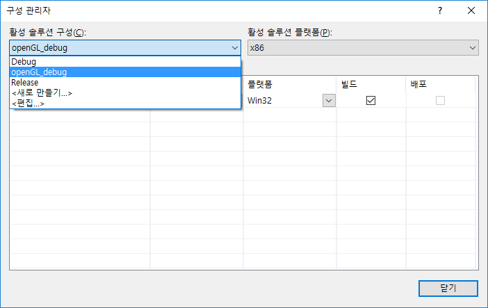 그런 다음 속성 페이지에서 우측 상단에 위치한 구성 관리자를 연다. 그런 다음 활성 솔루션 구성을 클릭하여, 새로 만들기를 한다. 새로 만들 솔루션 구성 이름은 아무거나, OpenGL_debug로 만들었다.