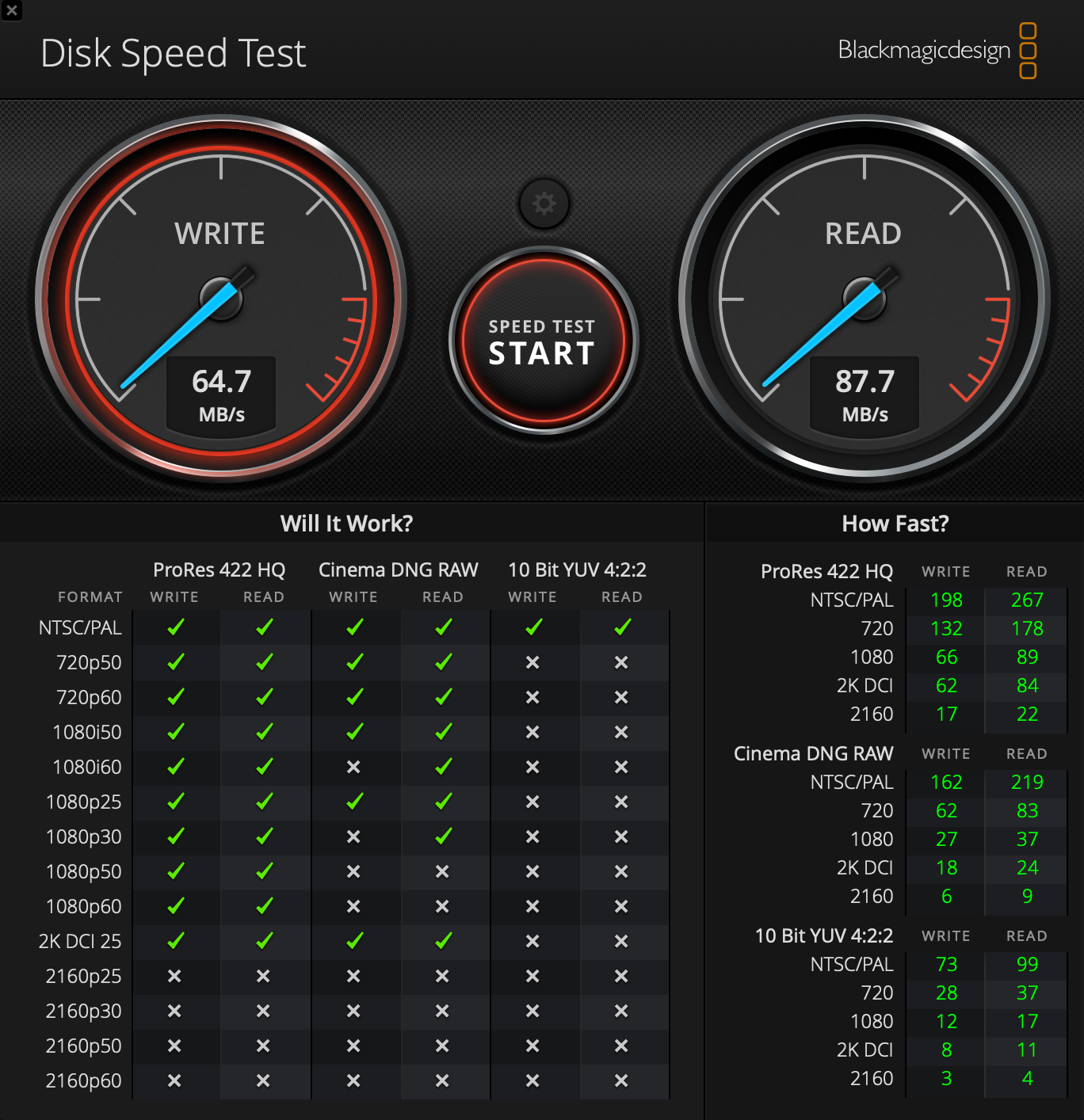 벤치 결과는 저렇게 나온다. 일단 쓰기 65MB/s 읽기 88MB/s이며, 생각보다 쓰기 속도가 준수했다. 그래 광고에 최대 읽쓰기라고 했지 최저 보장 속도라고는 안헀다.