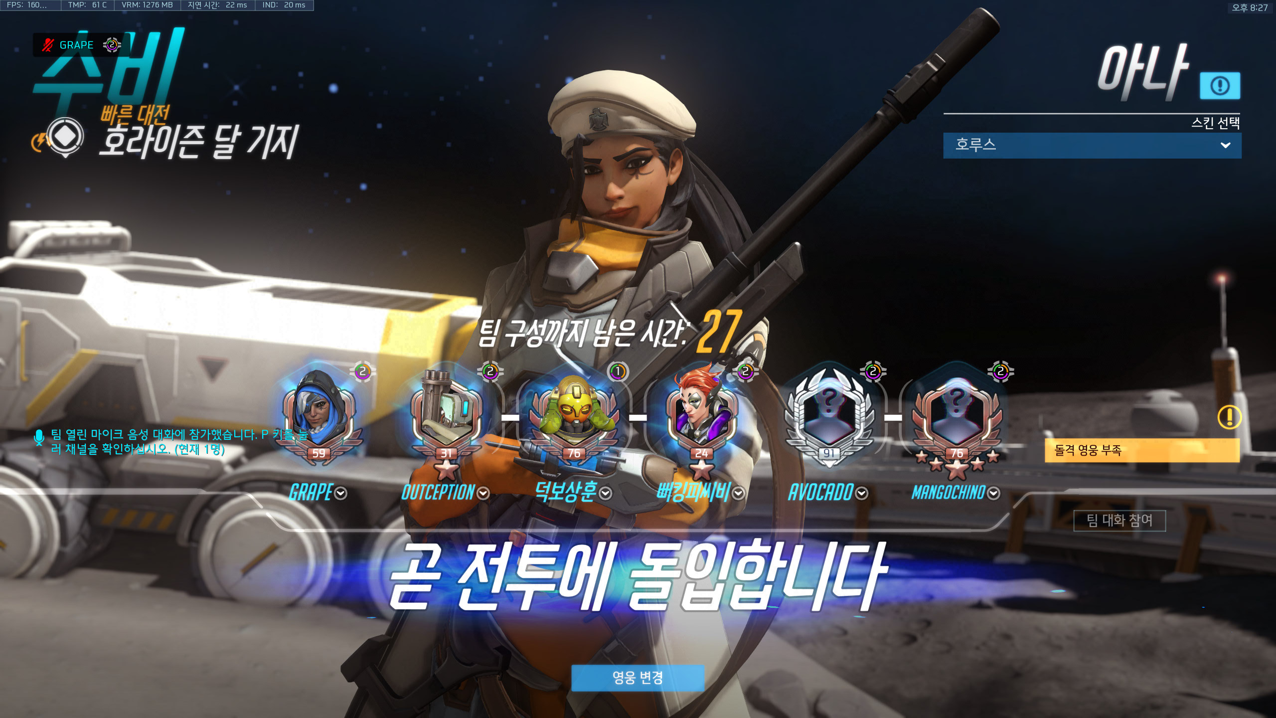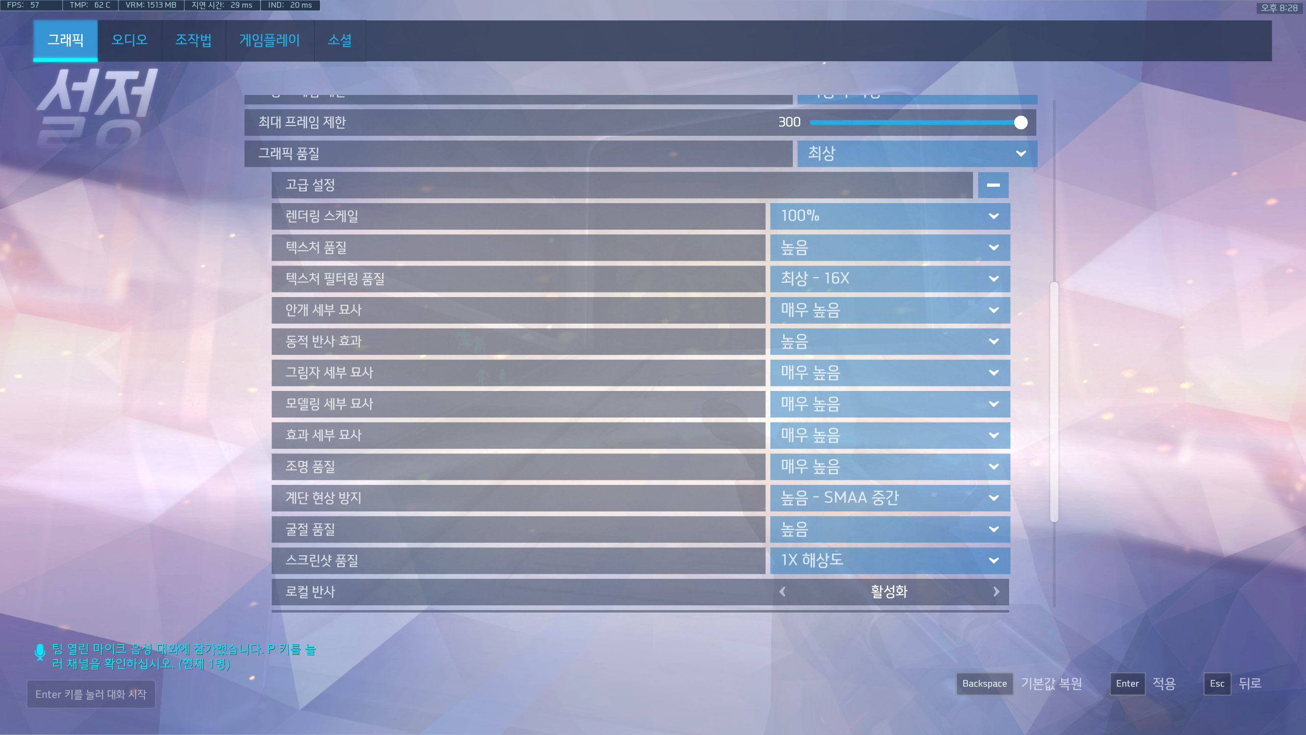 일단 대기실에서 100~115 프레임 정도가 나오며, 인게임에서 최대 180 프레임, 평균적으로 120~ 140 프레임을 유지한다.