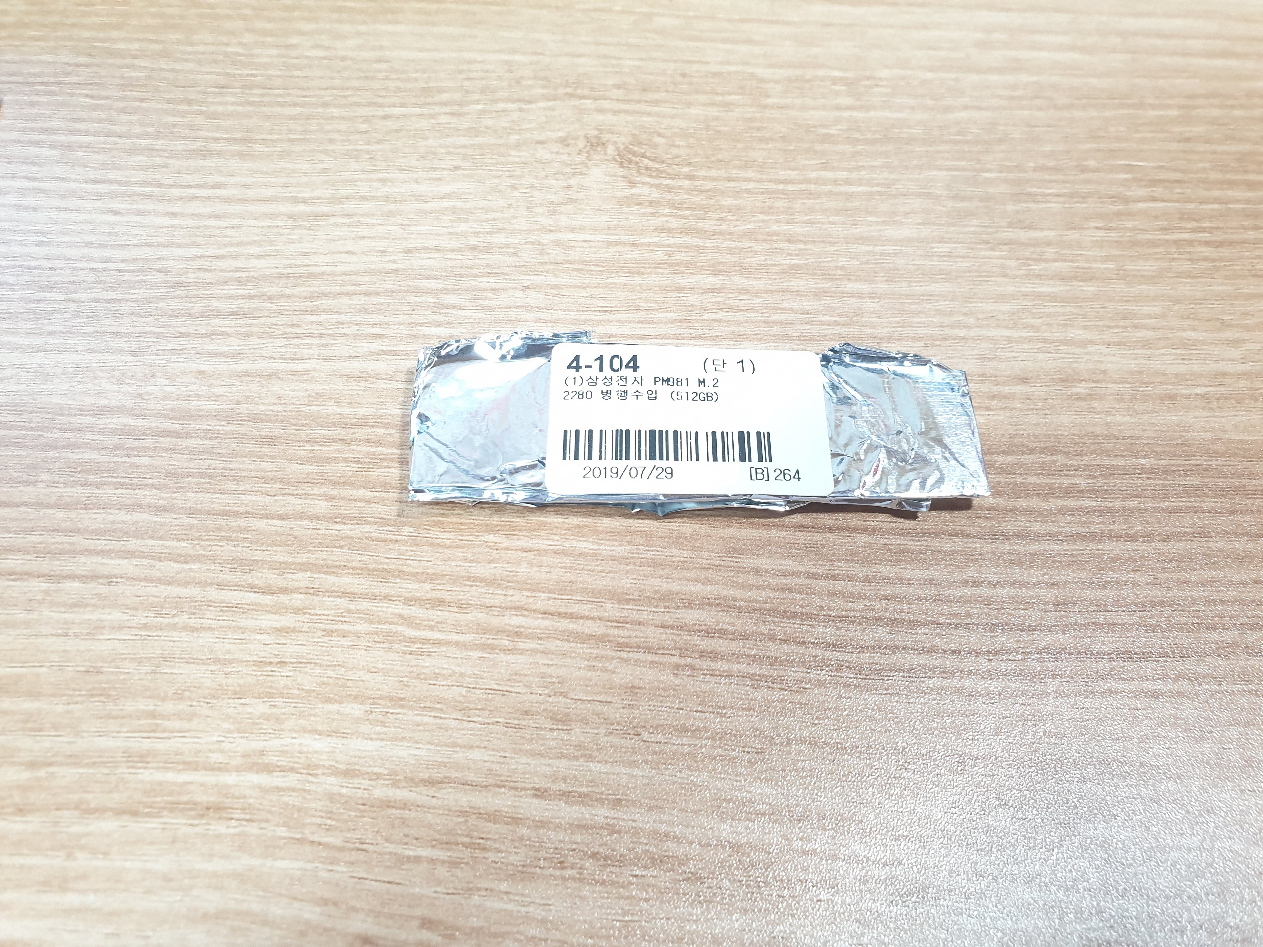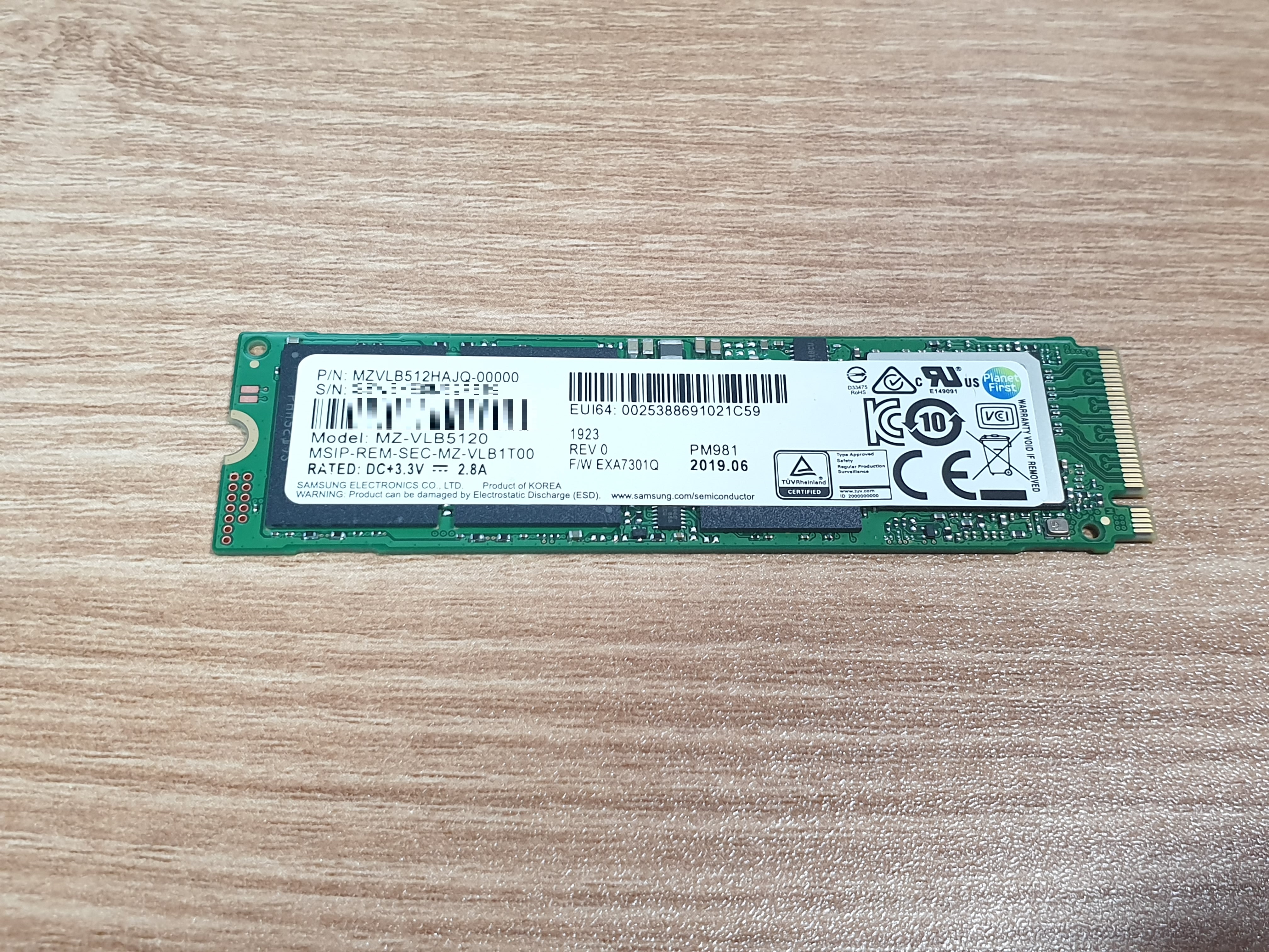 아무튼 은박지를 제거하고나면 PM981이 나타난다. 앞쪽에는 제품 번호와 시리얼 번호 그리고 제조 년월 및 주차가 적혀있다. 2019년 7월 말에 주문했는데 생산일자는 2019년 6월이며 23주차 제품이다.