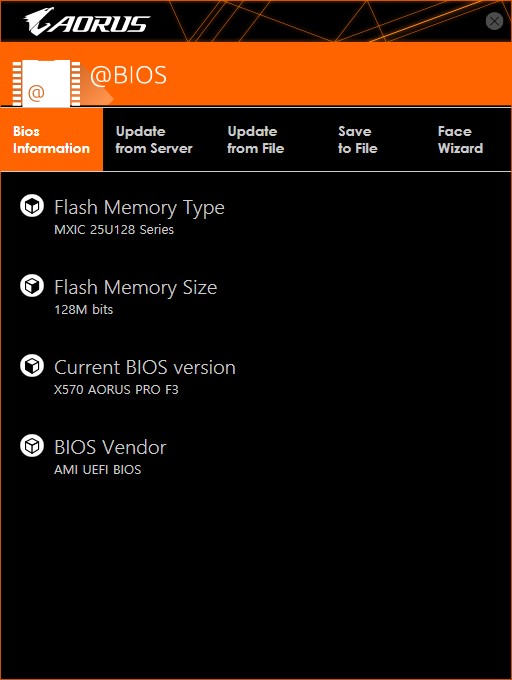 기가바이트 X570 어로스 보드는 Rev 1.0 기준으로 최초 출고시 F3(Combo pi 1.0.0.3A) 버전의 바이오스를 탑재하고 있다. 바이오스 업데이트 날짜는 2019-06-13이며, 이후로 총 2개의 바이오스(F4f, F4i)가 업데이트 되었다.
