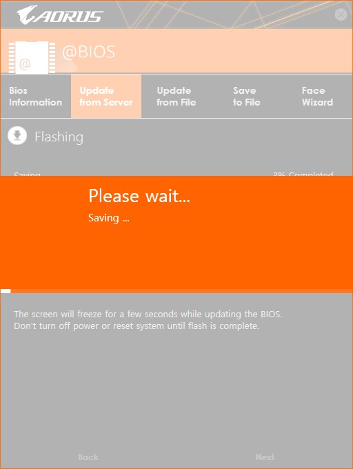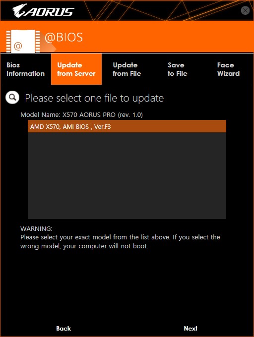 여기서는 Update from Server를 설명한다. (Update from File에서는 압축 해제한 바이오스 폴더에서 .f4i 또는 f4f등 자신이 다운로드한 바이오스 버전을 확장자로 하는 파일을 선택하면 된다.)
