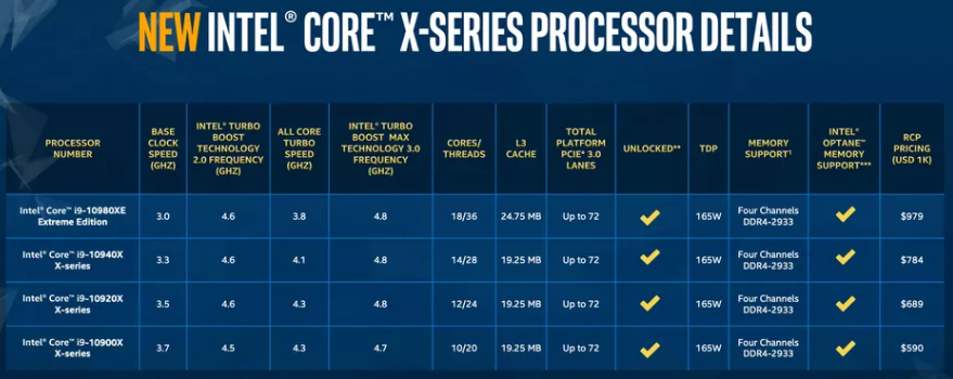 반면 인텔의 경우 비슷한 가격대의 i9-10940X가 베이스 3.3GHz, 터보부스트 4.8GHz 그리고 올코어 부스트가 4.1GHz이다. 특히 최상위 제품인 10980XE의 경우 올코어 부스트가 3.8GHz에 머물고 있다.