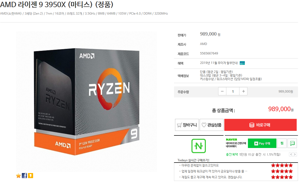 무려 1분 전, [컴퓨터] Ryzen 9 3950X 드디어 국내 출시!를 쓰면서 사야하나 말아야하나 고민하다가...