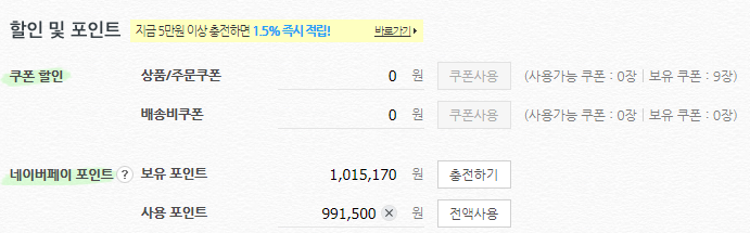 1.5%로 추가 적립이기 때문에 총 101만 5천원이 충전되었다.
