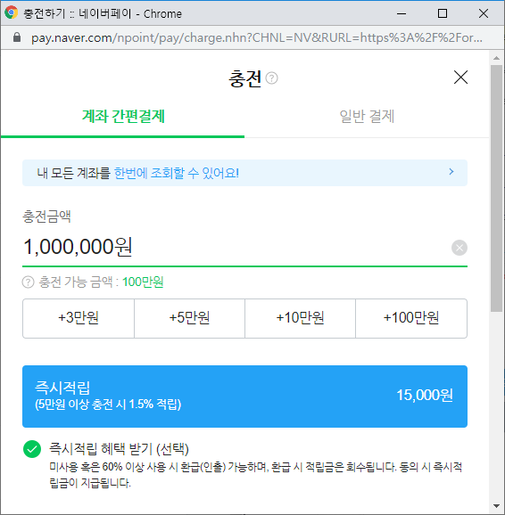 아무튼 당장 뛰어가서 네이버 페이에 100만원 충전을 했다. (내 통장에 100만원 취소선 생김)