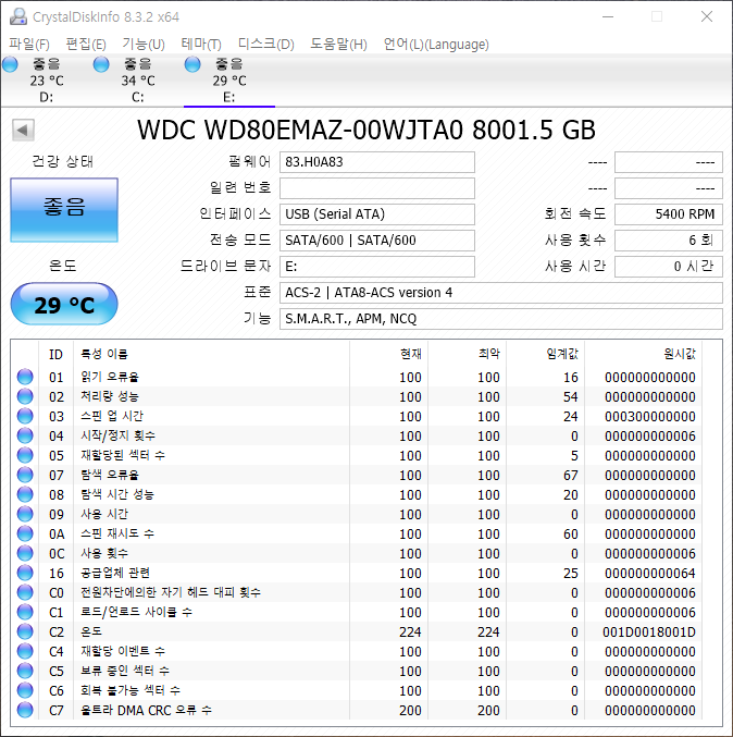 단, 최신 Elements는 WD80EMAZ-00M9AA0 모델로 5 플래터 & 공기 충전방식의 하드디스크가 들어가서 빠르지만 대신 발열이 심하다고 했는데, 내것의 경우 WD80EMAZ-00WJTA0 헬륨 충전버전이 들어있었다.