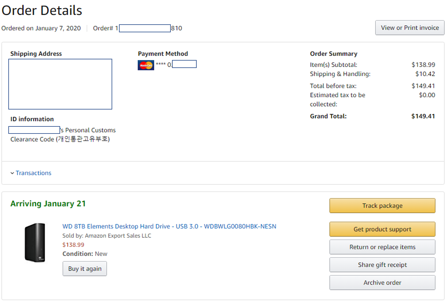 우선 가격은 138.99달러, 그리고 배송비 10.42달러로 총 149.41달러(지금 129.99달러에 판매중)이고, 이 상품은 아마존 물류 창고에서 직배송되는 상품이다. 1월 7일에 주문했고, 약 2주후인 1월 21일에 도착한다고 알림이 왔다.