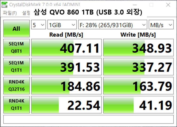 반면 2.5인치 SSD와 비교시에는 조금 밀린다. 특히 랜덤 읽쓰기는 당연히 바닥이고. 그래도 영상 스트림용으로 쓰는 개인 NAS에 연결될 예정이라 큰 문제는 없어보인다.