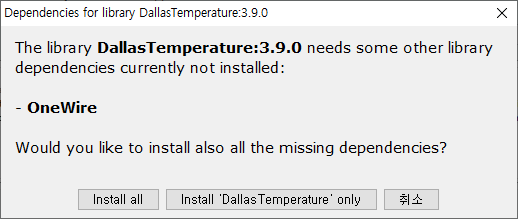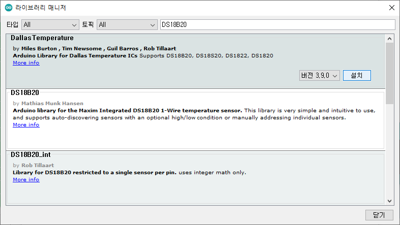 (2) 라이브러리 매니저에 DS18B20을 검색해서 Dallas Temperature를 설치하여 준다.