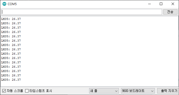 아래와 같이 시리얼 모니터에서 LM35에서 읽은 온도 값이 출력된다.