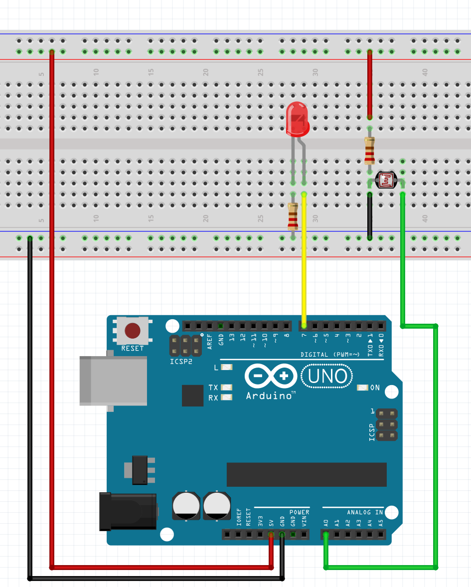 대략 10k 옴을 이용하면 아무리 광센서의 저항이 적어져도 과전류의 걱정은 없다. CDS 센서만으로는 할 수 있는게 없으니 LED를 이용해서 적당히 어두워지면 LED를 켜는 동작을 수행하자.