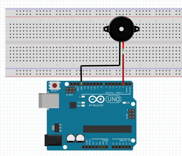 회로는 아래와 같이 단순하게 구성하면 된다. 만약 소리를 줄이고 싶다면 저항을 하나 연결해줘도 좋다. 단, 아두이노에서는 하나의 부저만 사용할 수 있다.