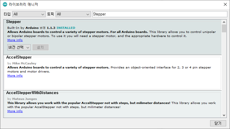아두이노의 라이브러리 매니저를 통해서 Stepper 라이브러리를 설치하자.