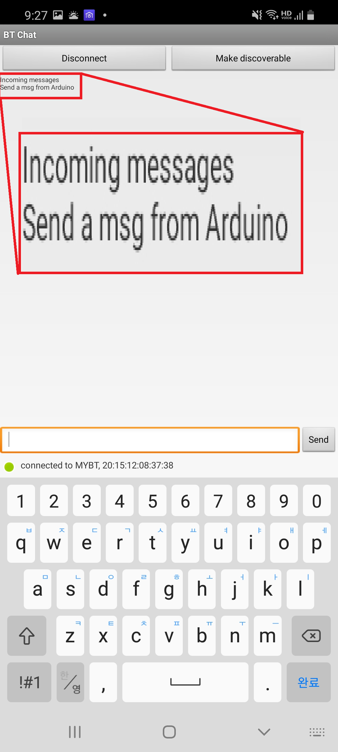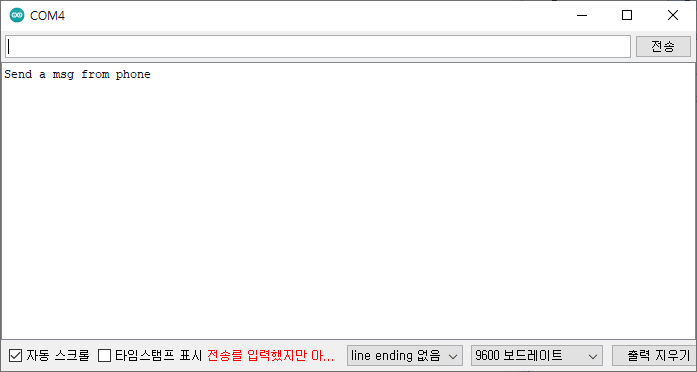 시리얼 모니터에서 "Send a msg from Arduino"를 전송하면 휴대폰에서 출력되고, 휴대폰에서 "Send a msg from phone"을 전송하면 시리얼 모니터에서 출력된다.