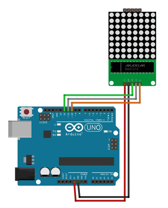 MAX7219 도트매트릭스 드라이버를 사용하면 16개의 핀에서 VCC, GND, DIN, CS, CLK 총 5개의 핀으로 줄일 수 있고, 여러개를 병렬로 연결해서 사용할 수 있다.