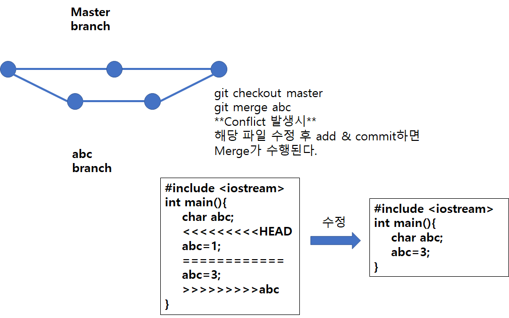 git merge abc // abc 브랜치를 master 브랜치로 합침
