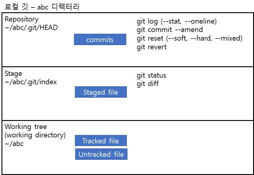 깃은 (1) 일반, (2) 버전 등록 대기 상태, (3) 버전 등록된 상태로 총 3가지 상태가 존재한다. 각 상태마다 저장되는 위치가 다르며, 이를 통하여 다시금 (1) working tree(혹은 working directory), (2) Stage, (3) Repository로 구분할 수 있다.