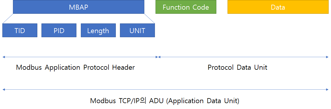 MBAP은 Modbus Application Protocol Header로, Tranaction Identifier (해당 패킷의 ID, 2byte), Protocol Identifier (프로토콜 ID, 2byte), 길이(1byte), Slave Unit ID(1byte)로 구성된다.