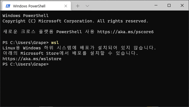 [3] 다시 powershell을 실행후 wsl 명령을 실행하면, 아래와 같이 배포판 설치 링크로 넘어간다.