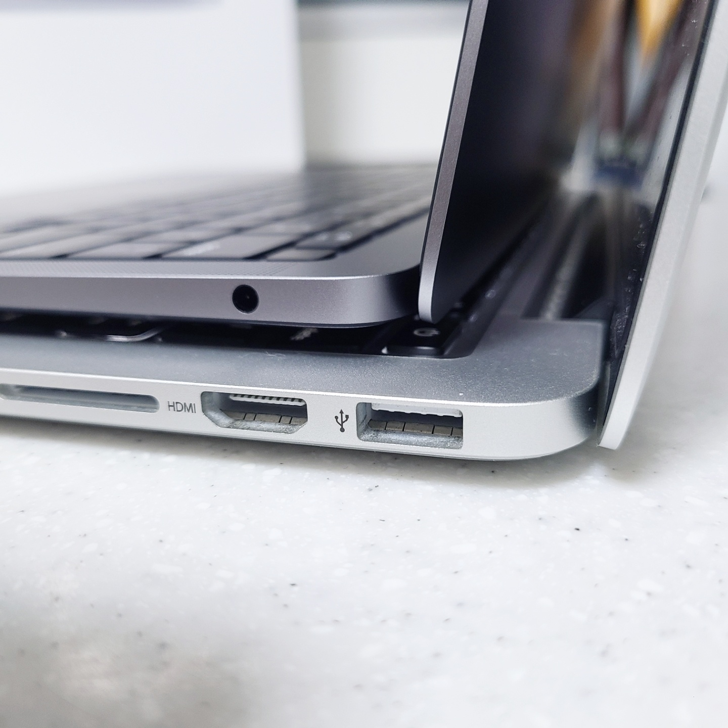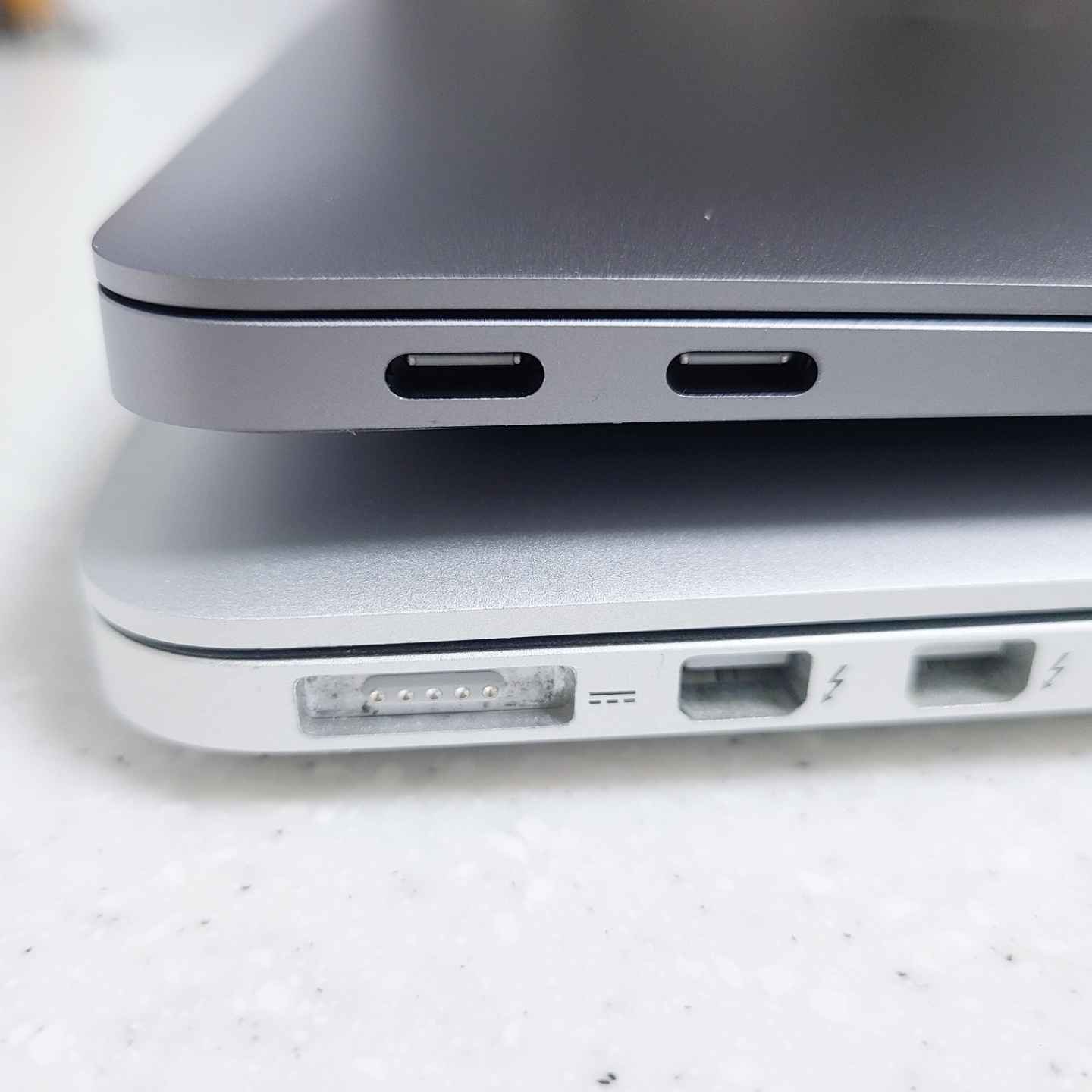 맥북 프로는 전체적으로 동일한 두께이다. 그래도 맥북 에어의 가장 두꺼운 부분이 맥북 프로보다는 얇게 보인다.