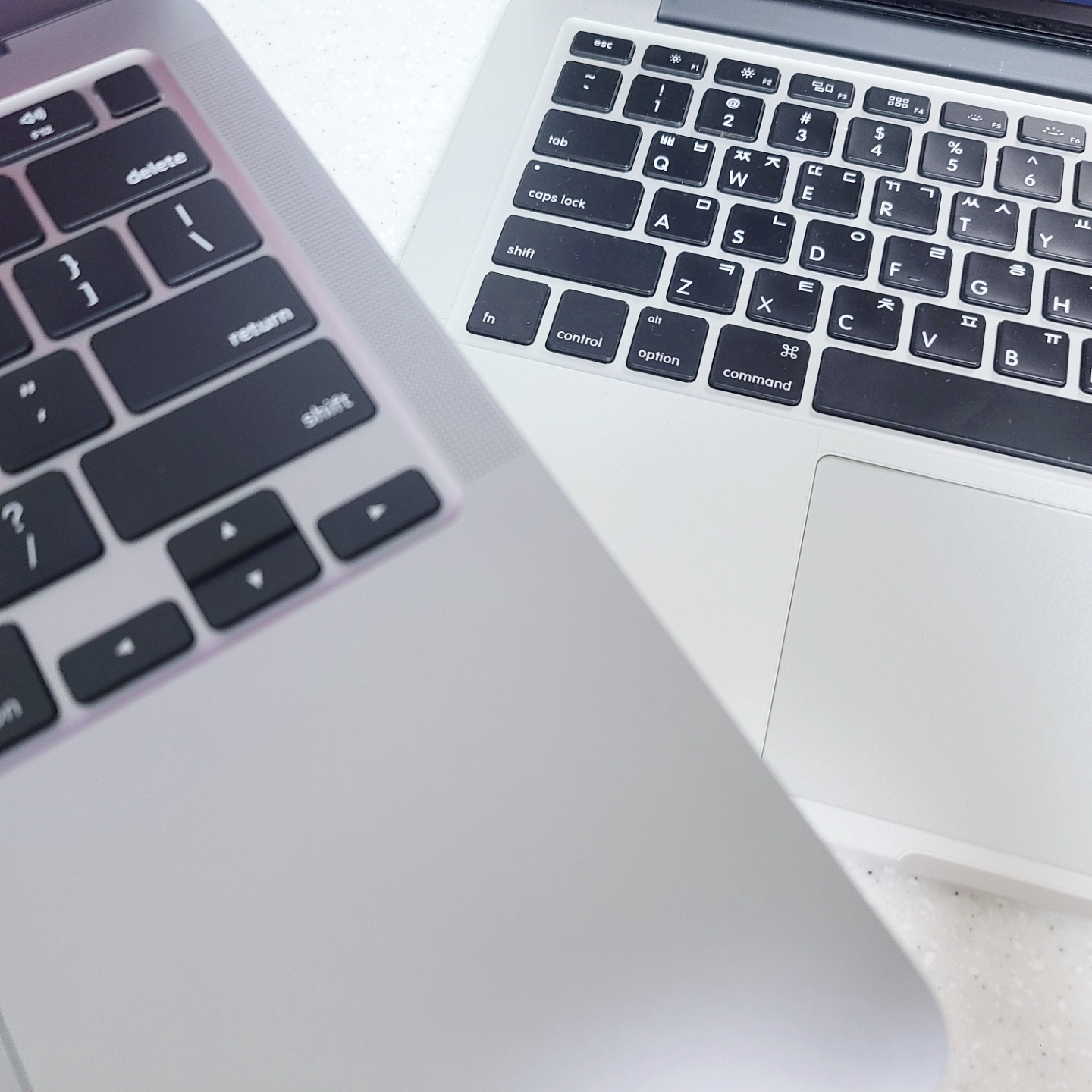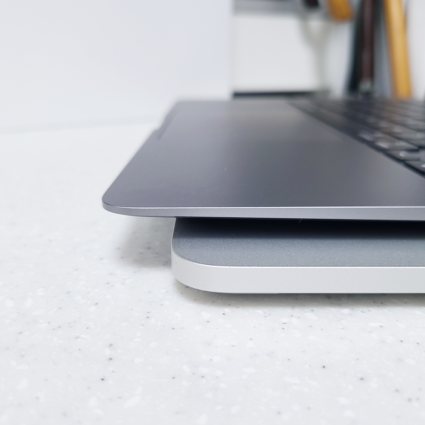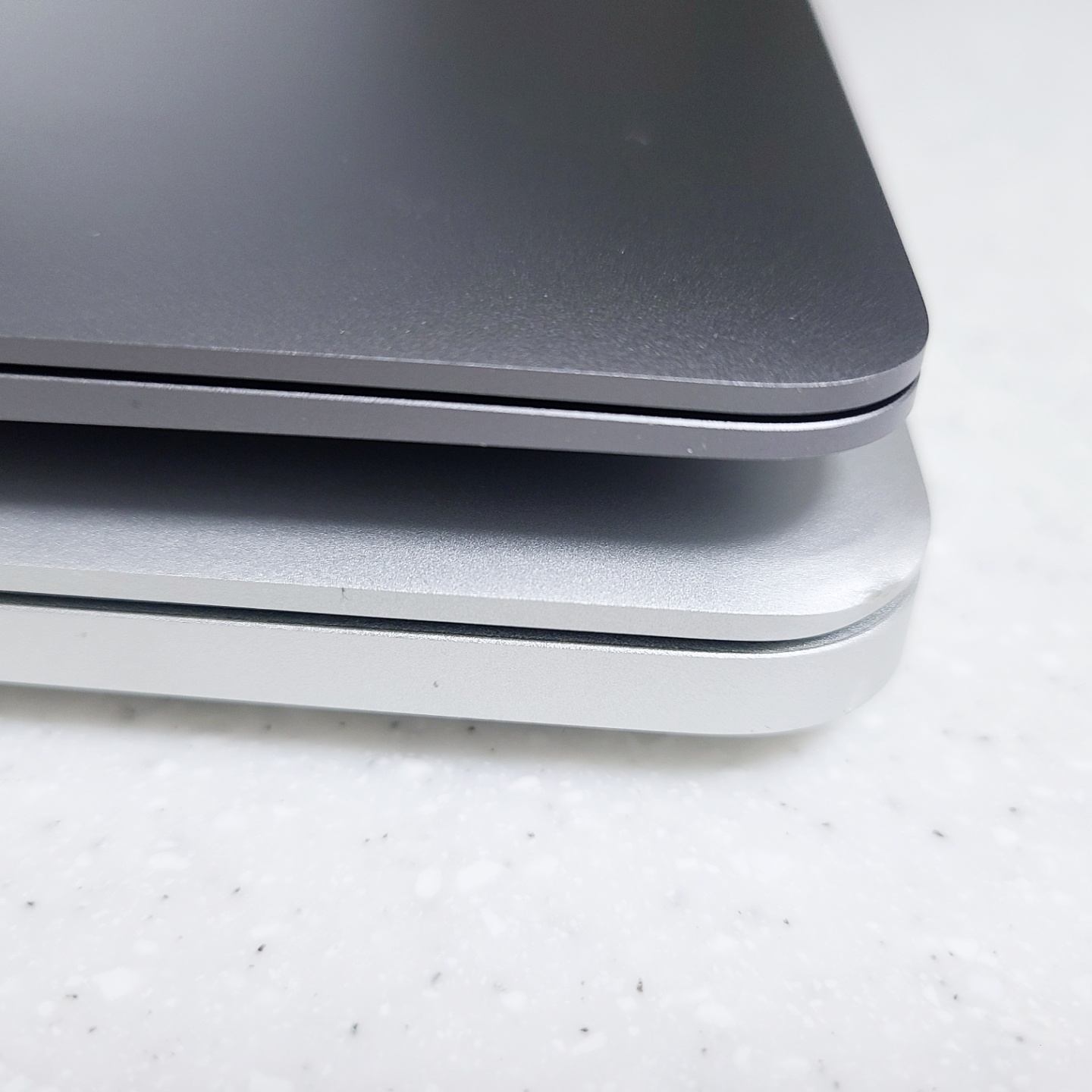 좌측 맥북 에어 스페이스 그레이와 우측 맥북 프로 실버의 색감 차이가 있다.