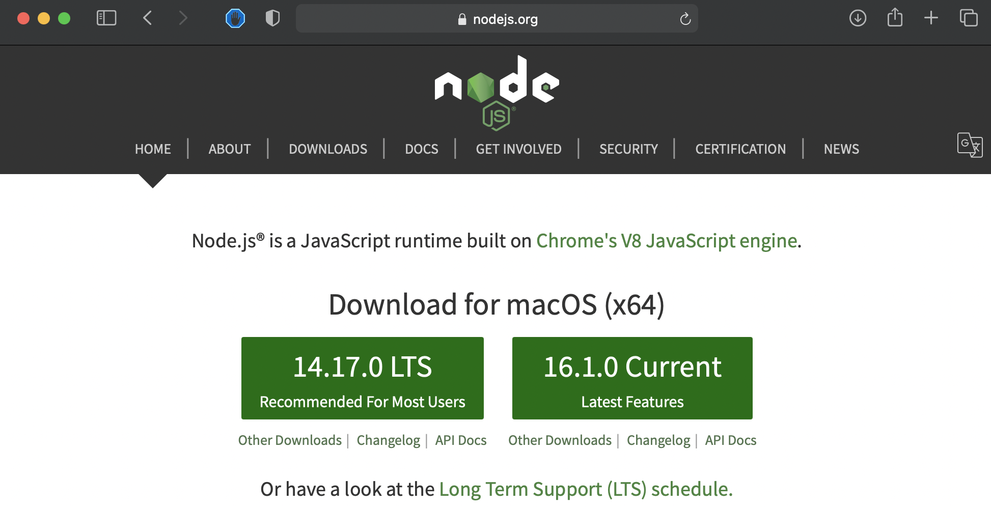 Node.js 공식 홈페이지에서 LTS 다운