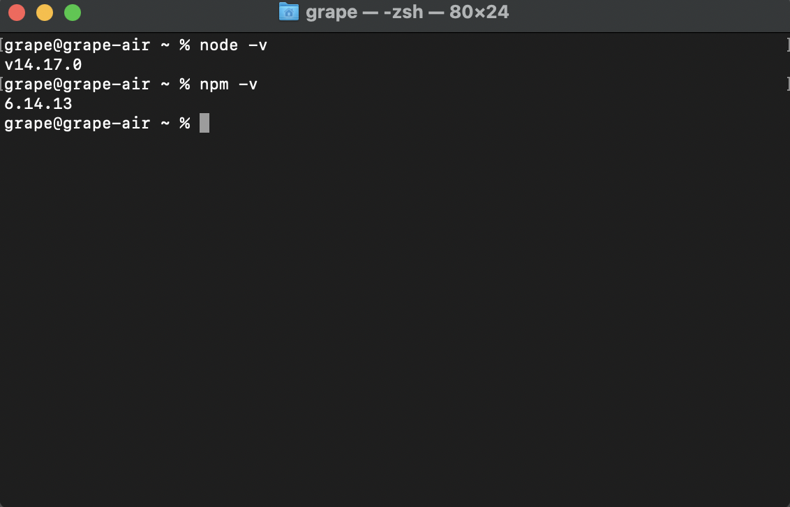 node -v, npm -v을 통하여 각각 버전을 확인한다.
