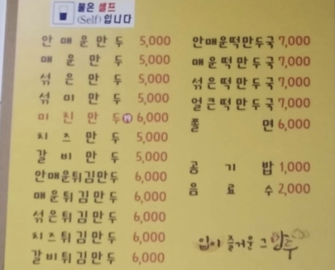 이 메뉴판 바로 옆에 각 메뉴별 만두 종류와 갯수가 적혀있다. 내가 방문할 당시 섞미 만두는 안매운만두 2개, 매운만두 2개, 미친만두 1개였다.