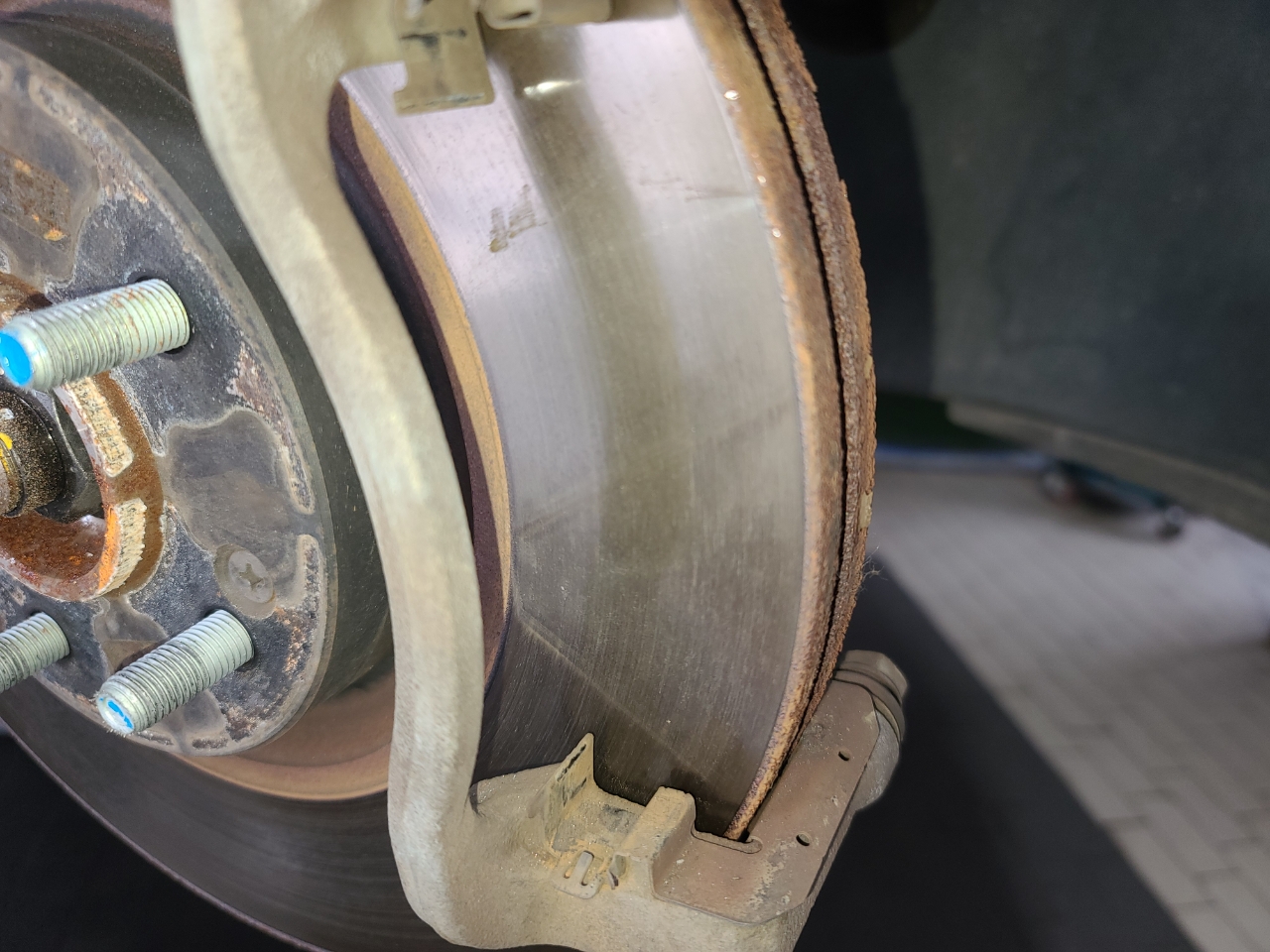 일단 내 브레이크 패드 상태이다. 왼쪽이 바깥면, 오른쪽이 안쪽면에 붙는 패드이다. 주구장창 바깥 패드만 확인해서 남아있는 줄 알았는데 안쪽 패드는 이미 모두 마모되었다.