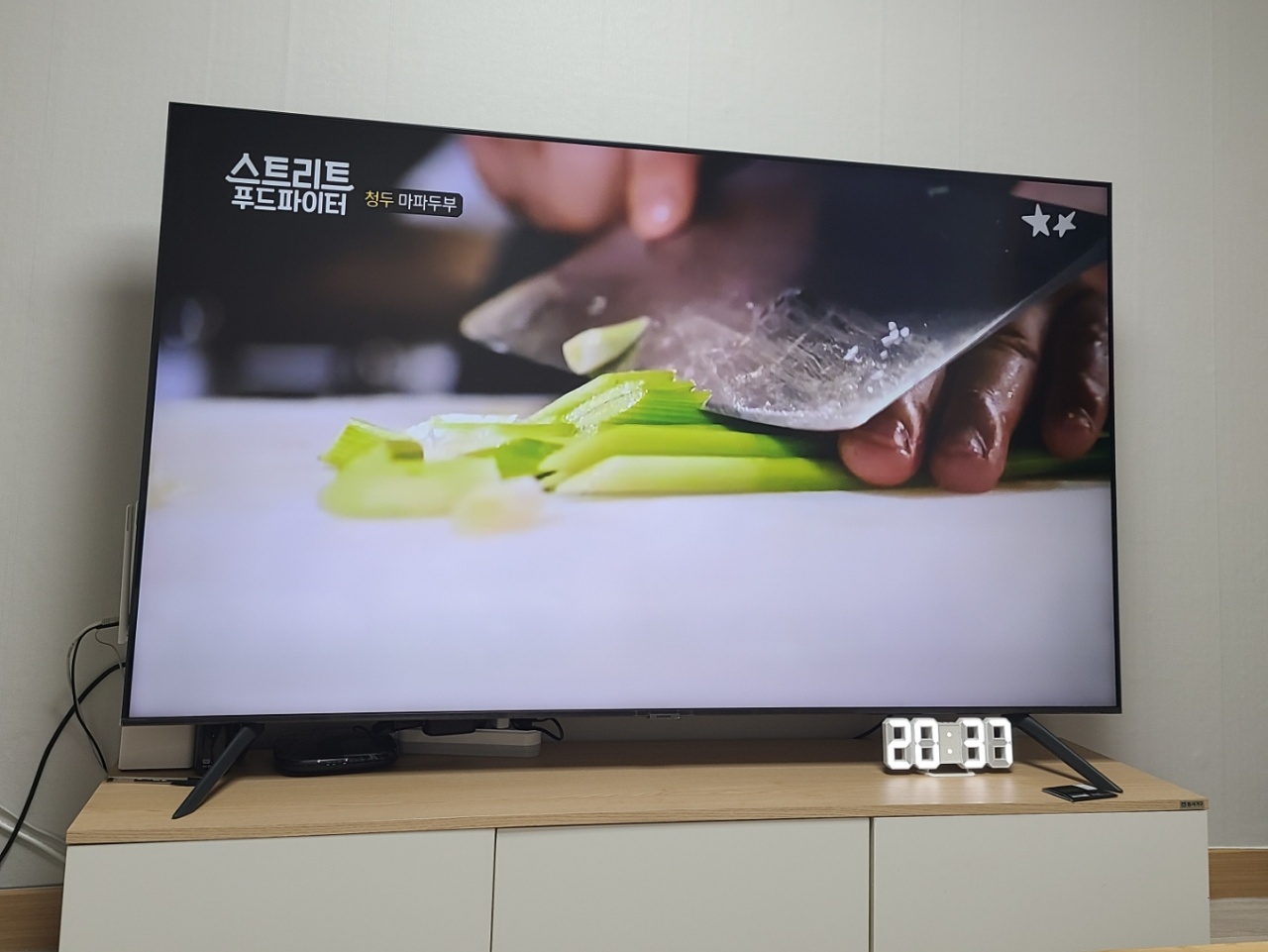 티비가 없었는데 일단 대형 티비가 생기면서 얻는 장점들이 많아진다. 특히 거실을 활용하기 시작했고, 여럿이서 식사를 할 때에도 오늘은 뭘 보면서 식사를 할지 고민하기도 한다.