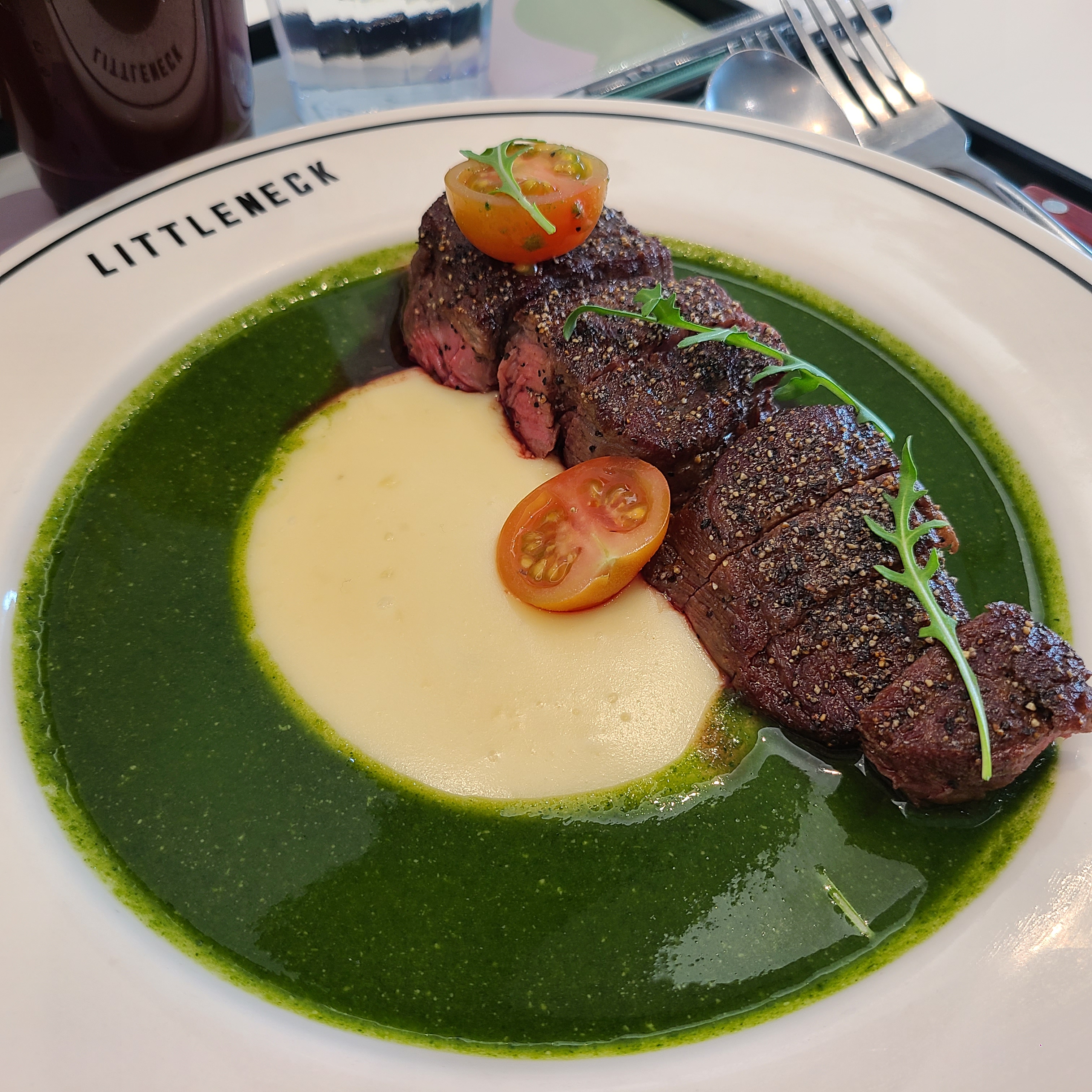 살치살은 일반적인 미디움레어의 스테이크였지만, 지미추리와 바질이 들어간 그린소스나 치즈가 들어간 메쉬드 포테이토 조합으로 먹어볼만한 메뉴