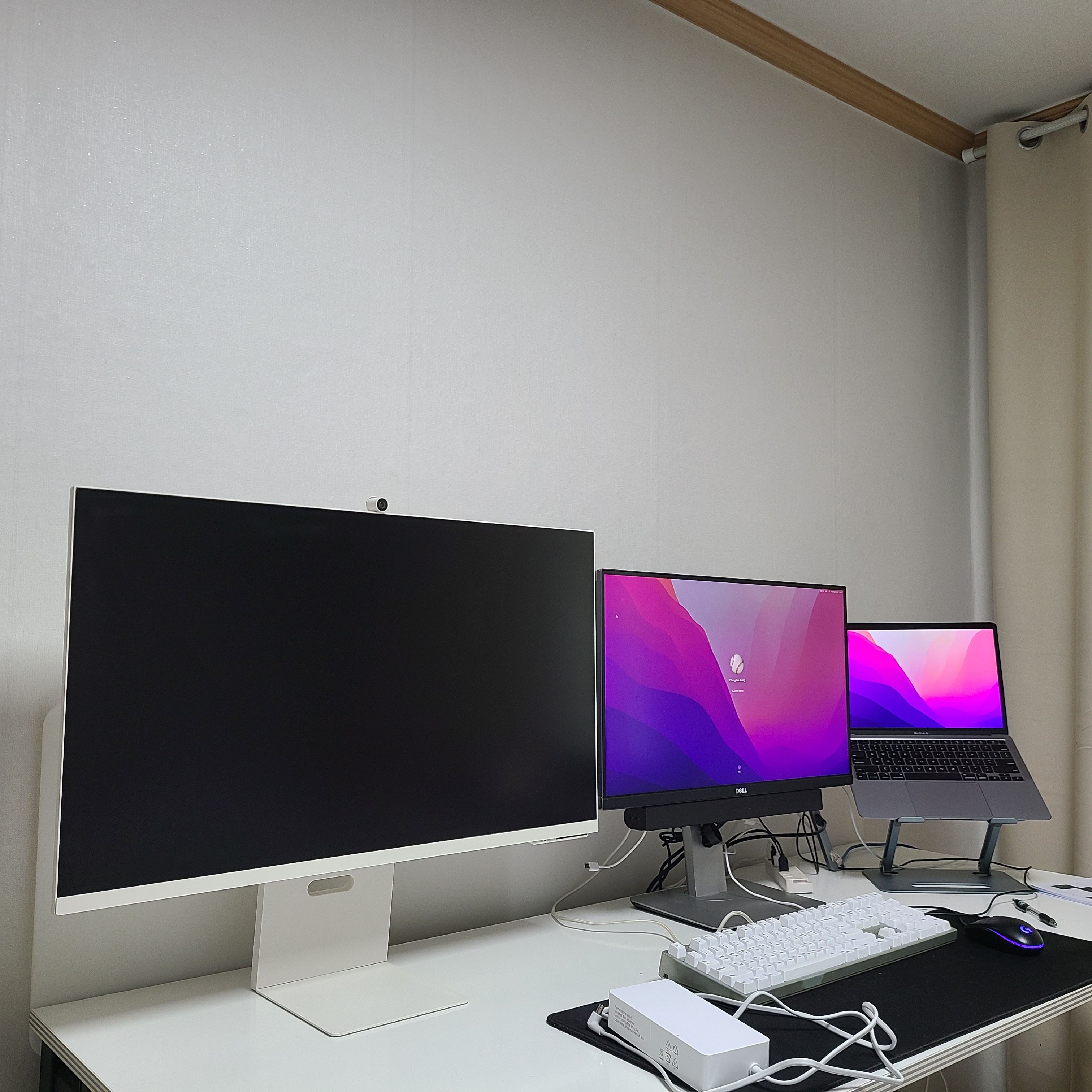 좌측부터 32인치 M8, 25인치 Dell 모니터, 맥북에어 순.