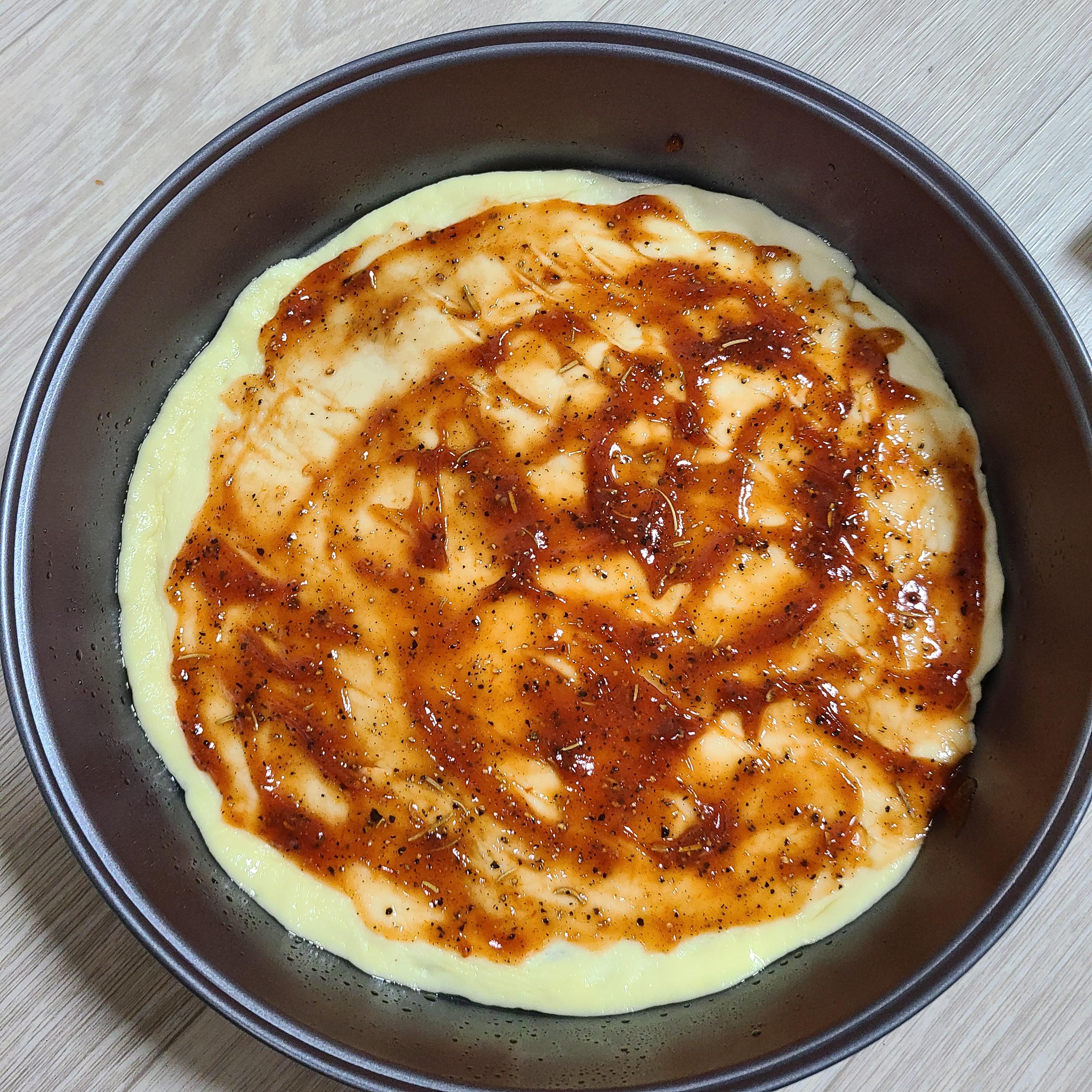 - 반죽을 넓게 펴고, 그 위에 케첩(토마토 소스)를 바른다.